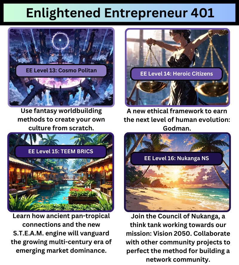 • Can you provide examples of ‘lifestyle gamification’ and ‘spiritual power’ within the Enlightened Entrepreneurship curriculum? Enlightened Entrepreneurship is based on applying typology systems to accurately profile yourself and your connections. Enlightenment is not  a fantasy nor a matter of luck. Enlightenment is you when you are Level 99 Overall. The central field study in Nukanga Network School is comparative doctrine studies with a concentration in typology. We continuously study and apply teachings from every spiritual, religious, philosophical and personal development framework created, to make each member’s ultimate level-up easy and fast. Lifestyle gamification involves treating life as a Role Playing Game using a life planning tool we designed called Marketball. And spiritual power comes from aligning your entire life with your unique talent.